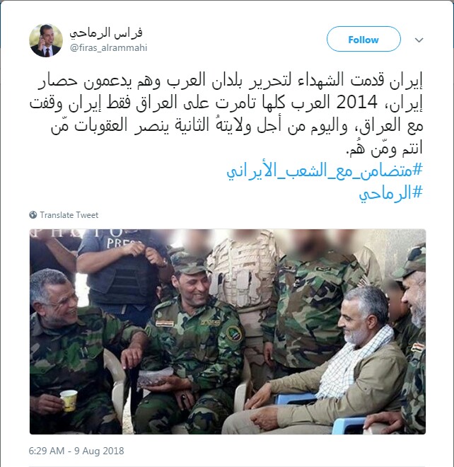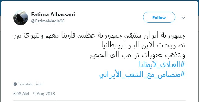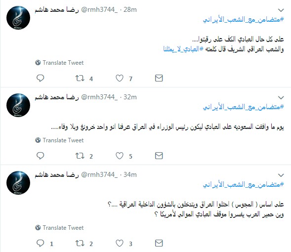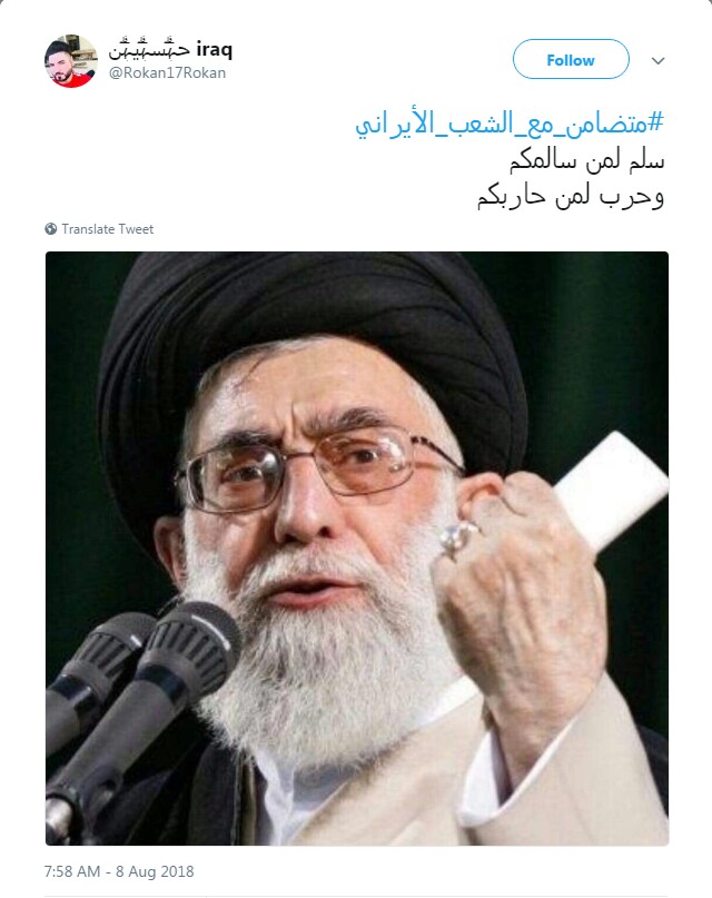 وتصدرت هاشتاقات #متضامن_مع_الشعب_الأيراني و#العبادي_لايمثلنا التويتر في العراق، حيث أبدى الشعب العراقي تضامنه الكامل مع الشعب الايراني ضد الحظر وأكد سياسة "تجويع الشعوب" الاميركية ستفشل فشلا ذريعا.