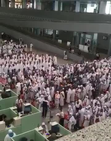 العالم الإسلامي - الكوثر: ضيوف الرحمن الأندونسيون يدخلون مطار جدة في موكب مهيب ومنشدين بصوت واحد (سلام الله على الهادي رسول الله؛ توسلنا بإسم الله وبالهادي رسول الله (ص)).