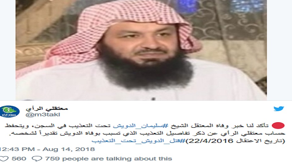 وقال “معتقلي الرأي” في تدوينة له عبر حسابه بموقع التدوين المصغر “تويتر” رصدتها “وطن”:” تأكد لنا خبر وفاة المعتقل الشيخ #سليمان_الدويش تحت التعذيب في السجن”.