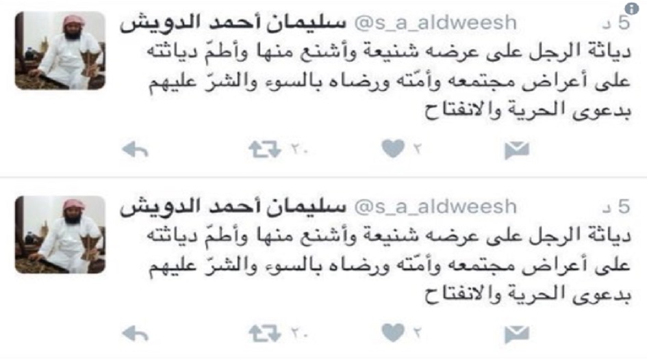 ولم يتورع الدويش عن وصف محمد بن سلمان بـ “الدياثة” من دون أن يسميه وقال في تغريدة: “دياثة الرجل على عرضه شنيعة وأشنع منها وأطمّ دياثته على أعراض مجتمعه وأمّته ورضاه بالسوء والشرّ عليهم بدعوى الحرية والانفتاح”.