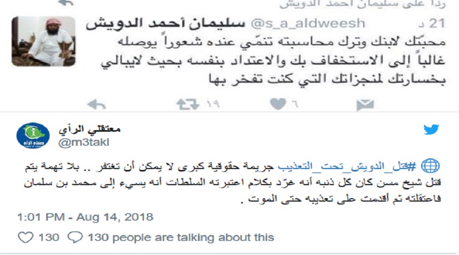 واعتبر الحساب #قتل_الدويش_تحت_التعذيب جريمة حقوقية كبرى لا يمكن أن تغتفر .. مضيفا ” بلا تهمة يتم قتل شيخ مسن كان كل ذنبه أنه غرّد بكلام اعتبرته السلطات أنه يسيء إلى محمد بن سلمان فاعتقلته ثم أقدمت على تعذيبه حتى الموت “.
