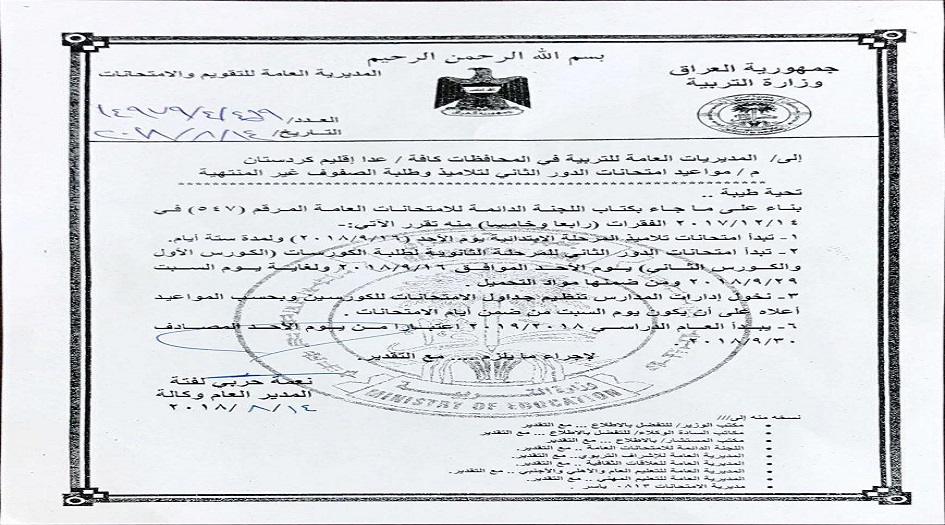 ونبه البيان إلى إن "الامتحان الذي يصادف في يوم عطلة ينقل إلى اليوم الذي يليه ، متمنياً لجميع طلبتنا الموفقية والنجاح"
