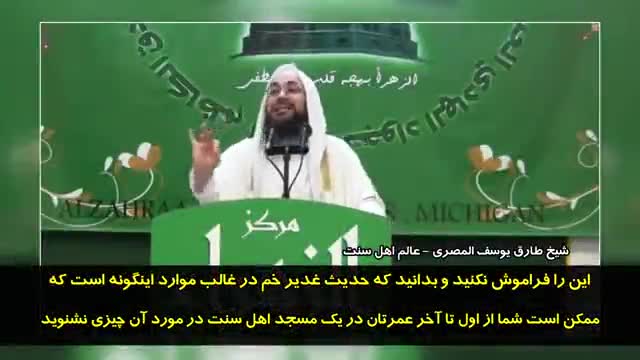 الشيخ طارق المصري وهو واحد من شيوخ السنة يقول لم يسمع المسلمون السنة أبدا بحديث غدير خم مع أنه موجود في صحيح مسلم والترمذي وموجود في كتب التاريخ والسنن وفي صحيح أحمد حيث اجتمع الرسول بالمسلمون وقال من كنت مولاه فهذا علي مولاه.