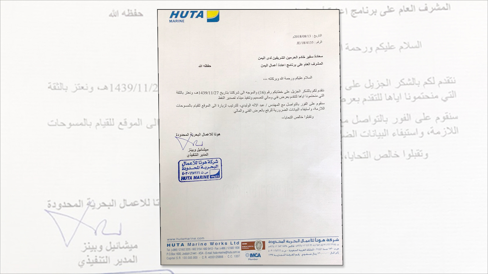 وبحسب الوثيقة التي تتضمن رسالة من شركة "هوتا" للأعمال البحرية، إلى السفير السعودي لدى اليمن، محمد آل جابر، تعبر عن شكرها له على ثقته بالشركة، الذي منحها إعداد "عرض فني ومالي لتصميم وتنفيذ ميناء لتصدير النفط".