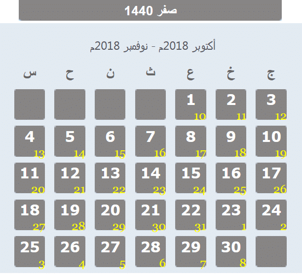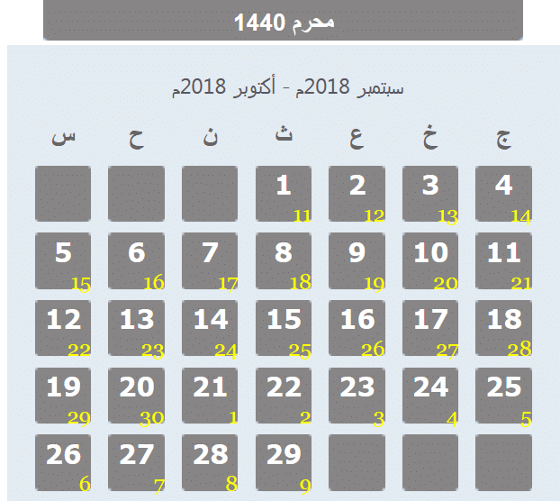التقويم الهجري 1440 والتقويم الميلادي 2018