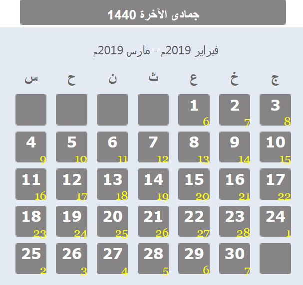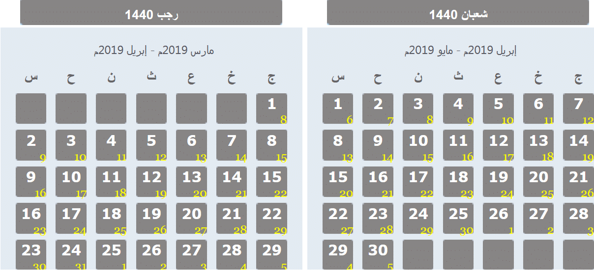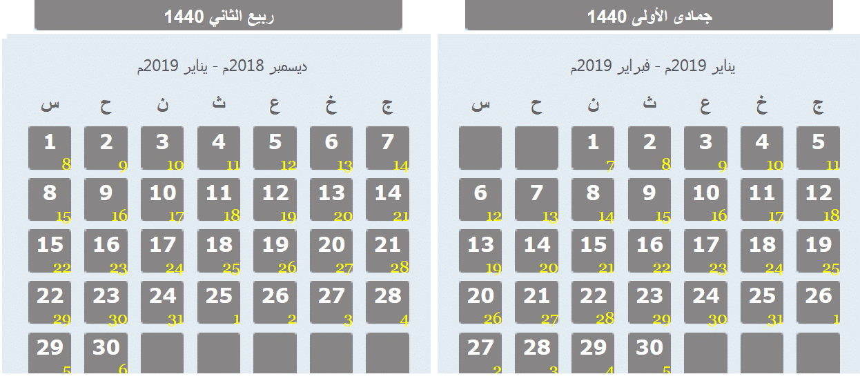 التقويم الهجري 1440 والتقويم الميلادي 2019