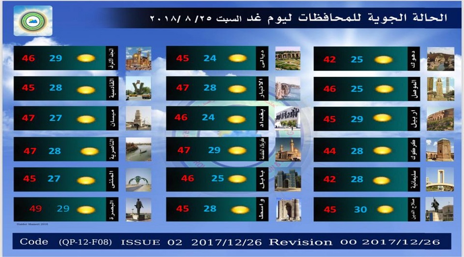 العراق_الكوثر :نشرت هيئة الانواء الجوية العراقية جدولآ يكشف عن درجات الحرارة المتوقعة ليوم غد السبت في المحافظات العراقية .