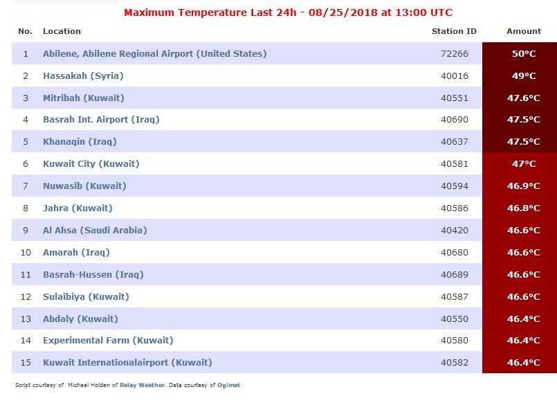 ونشرت محطة "بلاسيرفيلي" في كاليفورنيا الأمريكية، جدولاً بأعلى درجات الحرارة في العالم، والتي بينت أن أربع مدن عراقية من أصل 15 مدينة مدرجة بالجدول احتلت مراكز الأعلى بدرجات الحرارة.