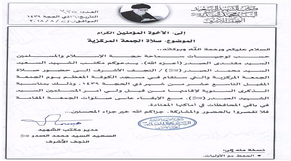 يذكر أن الصدر كان قد دعا العام الماضي، أنصاره إلى الحضور لمسجد الكوفة لاقامة صلاة جمعة موحدة بمناسبة الذكرى السنوية لإقامة أول صلاة جمعة من قبل والده المرجع الراحل السيد محمد الصدر.