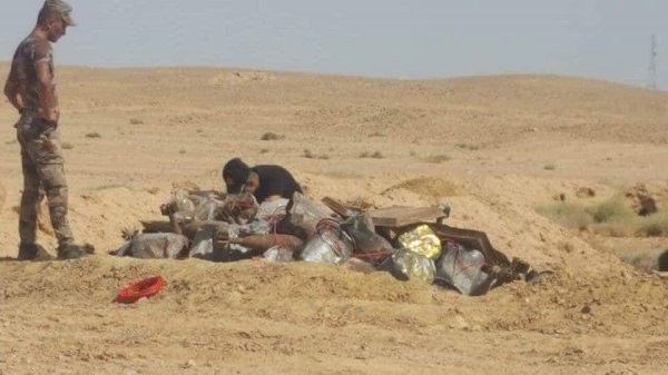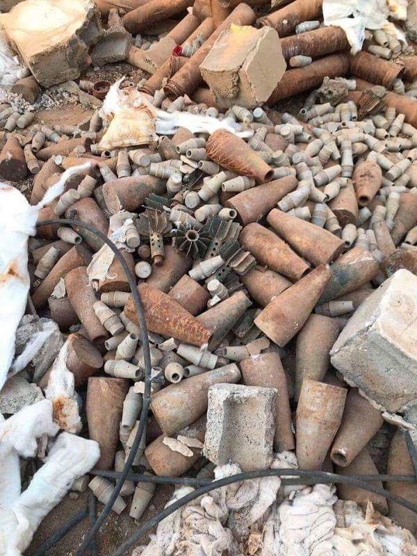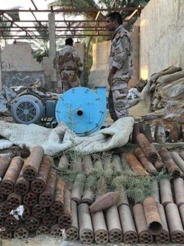 واضافت " ويحتوي الكدس على 150 عبوة ناسفة، و750 قنبرة هاون 120 ملم، بالإضافة الى 600 قاعدة صواريخ كاتيوشا محلية الصنع، و500كغم من مادة السيفور شديدة الانفجار مع 6 جليكانات سعة 20 لترا مملوءة بمادة نترات الامونيا، و3 مساطر تفجير ".