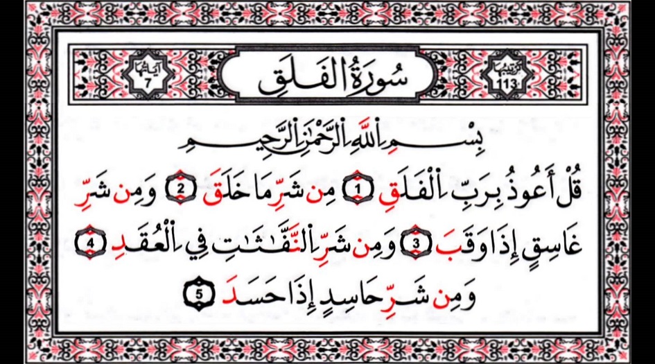 قُلْ أَعُوذُ بِرَب الْفَلَقِ(1) مِن شرِّ مَا خَلَقَ(2) وَ مِن شرِّ غَاسِق إِذَا وَقَب(3) وَ مِن شرِّ النَّفَّثَتِ فى الْعُقَدِ(4) وَ مِن شرِّ حَاسِد إِذَا حَسدَ(5)