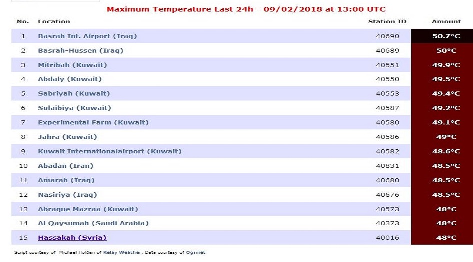 ونشرت محطة "بلاسيرفيلي" في كاليفورنيا الأمريكية، جدولاً بأعلى درجات الحرارة في العالم، والتي بينت أن أربع مدن عراقية من أصل 15 مدينة مدرجة بالجدول احتلت مراكز الأعلى بدرجات الحرارة من ضمنها البصرة التي تصدرت تلك المدن.