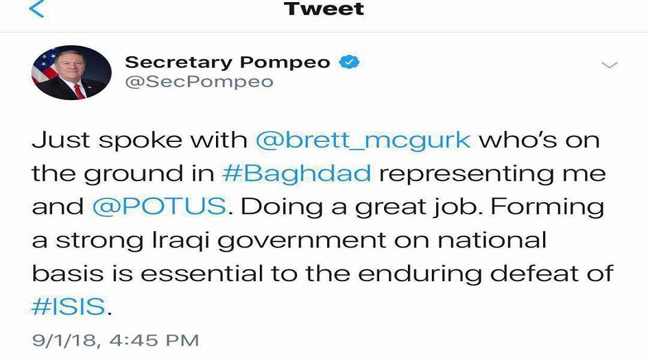 كما كتب مساء الاحد وزير الخارجية الامريكي في تغريدة في حسابه الرسمي على "تويتر": "تكلمت قبل قليل مع برت وهو موجود على الارض في بغداد وهو يمثلني ويمثل رئيس الولايات المتحدة. يقوم بعمل عظيم. تشكيل حكومة عراقية قوية على أسس وطنية ضروري لتحقيق هزيمة داعش".