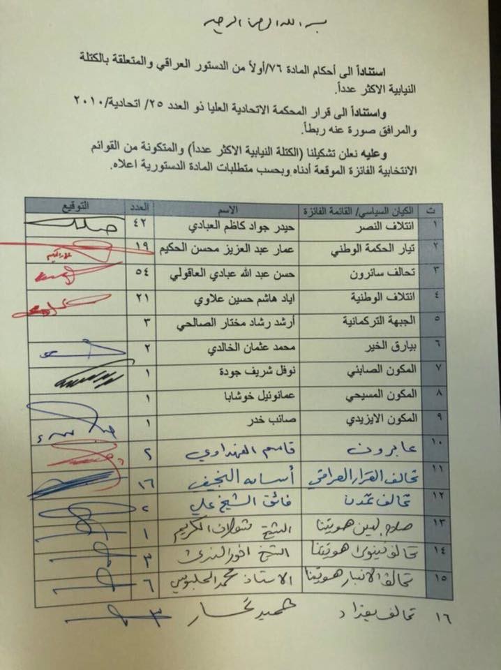وتداولت وسائل إعلام محلية وثيقة أدرجت القوى المنضوية في التحالف الجديد، الذي ضم كذلك تحالفات "إرادة" و"قلعة الجماهير" و"الأنبار هويتنا" و"كفاءات" و"بابليون" وتجمع الشبك وجزء من ائتلاف الوطنية وجزء آخر من تحالف النصر.