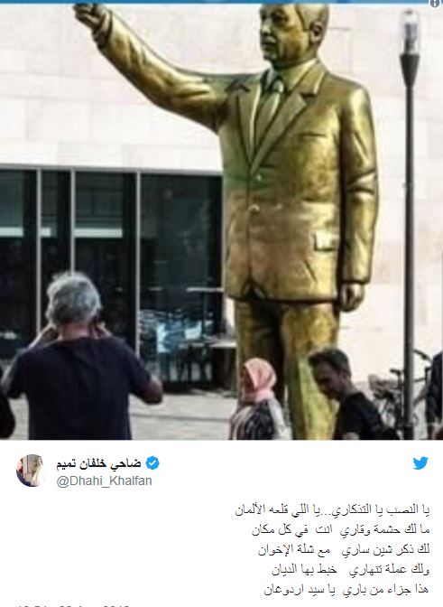 ونشر خلفان صورة لتمثال نصب في مدينة فيسبادن الألمانية لأردوغان، قبل يومين، وتم تشويهه لاحقا من قبل مجهولين، برغم أن من نصبه قصد الإساءة للرئيس التركي، بحسب وسائل إعلام.