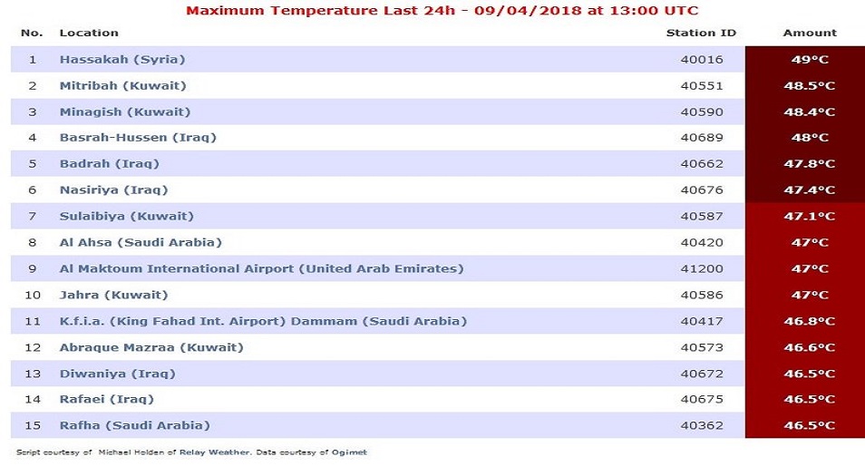 ونشرت محطة "بلاسيرفيلي" في كاليفورنيا الأميركية وهي محطة عالمية معنية بالأنواء الجوية، جدولاً بأعلى درجات الحرارة في العالم، والتي بينت أن خمس مدن عراقية من أصل 15 مدينة مدرجة بالجدول احتلت مراكز الأعلى بدرجات الحرارة.