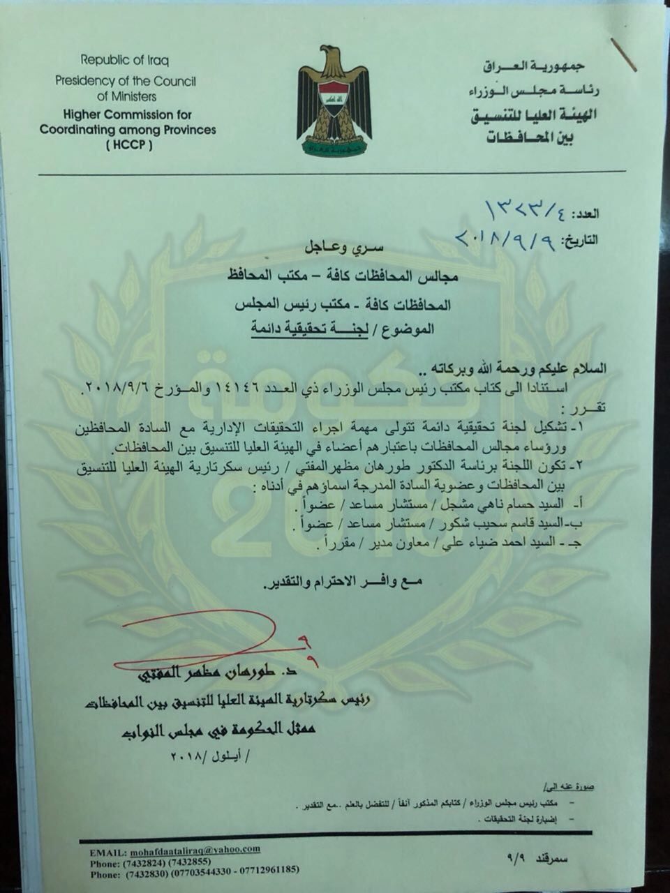 فقد تقرر "إستناداً الى كتاب مكتب رئيس مجلس الوزراء المؤرخ في 6 أيلول الجاري، تشكيل لجنة تحقيقية دائمة تتولى مهمة إجراء التحقيقات الإدارية مع المحافظين ورؤساء مجالس المحافظات باعتبارهم أعضاء في الهيئة العليا للتنسيق بين المحافظات".