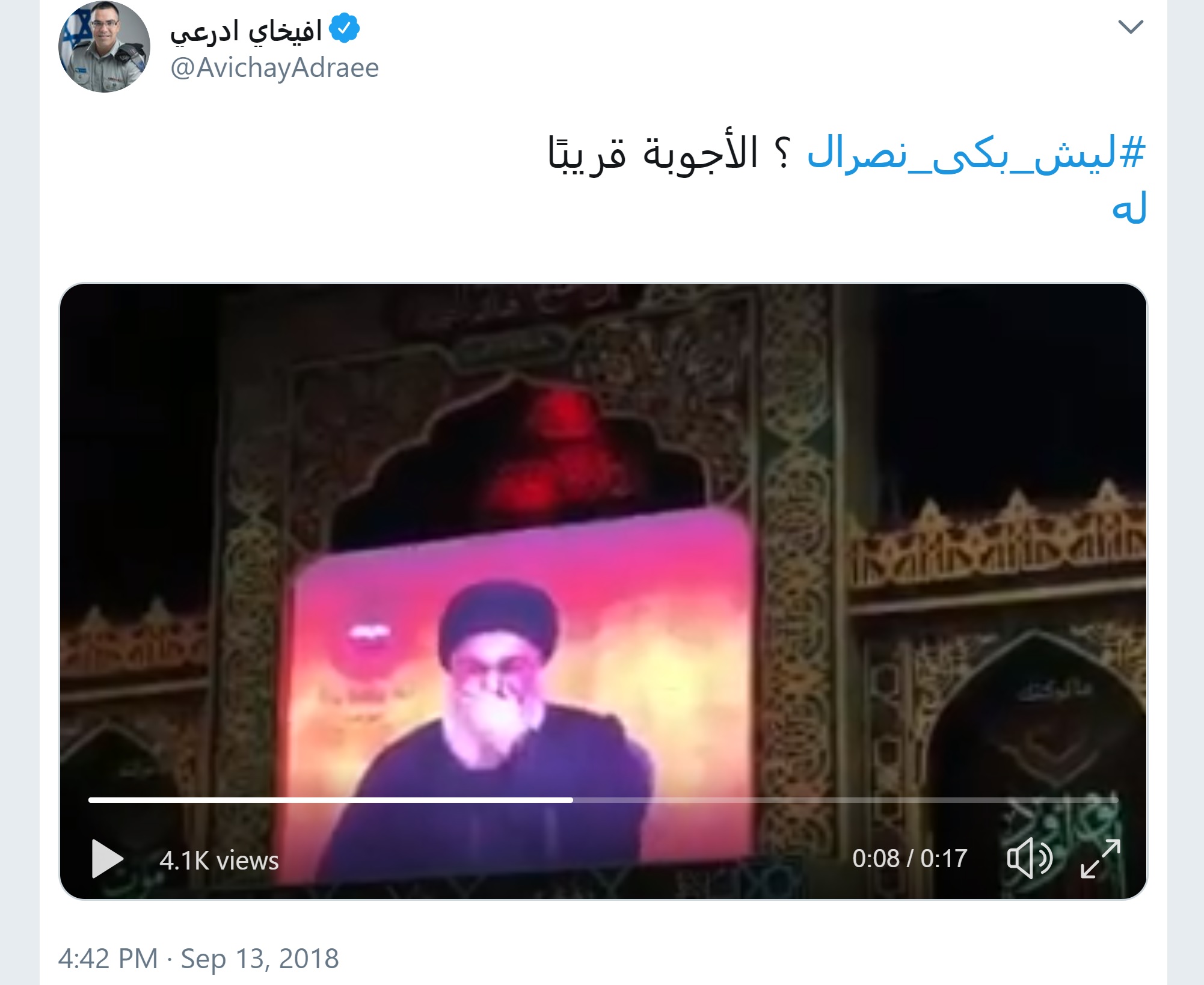 ونشر أفيخاي أدرعي عبر حسابه الرسمي على تويتر، جزءاً من الفيديو الذي يبكي فيه السيد نصرالله، أثناء خطابه في إحياء ليالي عاشوراء أمس في الضاحية الجنوبية لبيروت، حيث كان يقول: "سنقول للإمام الحسين كما قال أئمتنا من هوان الدنيا على الله سبحانه وتعالى..." ومن ثم يبدأ في البكاء على الهواء مباشرة.
