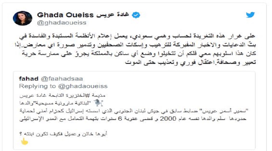 وقالت "عويس" في تدوينات لها عبر حسابها بموقع التدوين المصغر "تويتر" رصدتها "وطن" تعليقا على تطاول مغرد سعودي عليها ونسبه إليها ما ليس بها: " على غرار هذه التغريدة لحساب وهمي سعودي، يعمل إعلام الأنظمة المستبدة والفاسدة في بثّ الدعايات والاخبار المفبركة للترهيب وإسكات الصحفيين وتدمير صورة اي معارض.إذا كان هذا اسلوبهم معي فلكم أن تتخيلوا وضع أي ساكن بالمملكة يجرؤ على ممارسة حرية تعبير وصحافة.اعتقال فوري وتعذيب حتى الموت".