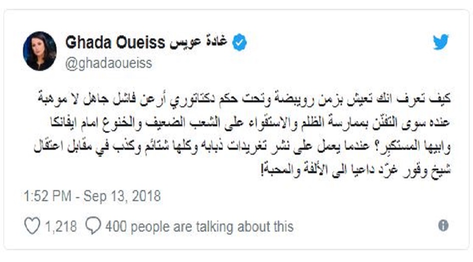 وأضافت في تغريدة أخرى:" كيف تعرف انك تعيش بزمن رويبضة وتحت حكم دكتاتوري أرعن فاشل جاهل لا موهبة عنده سوى التفنّن بممارسة الظلم والاستقواء على الشعب الضعيف والخنوع امام ايفانكا وابيها المستكبِر؟ عندما يعمل على نشر تغريدات ذبابه وكلها شتائم وكذب في مقابل اعتقال شيخ وقور غرّد داعيا الى الألفة والمحبة!".
