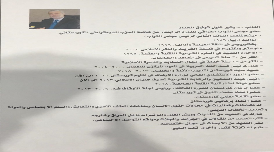 وادناه السيرة الذاتية للنائب الثاني لرئيس مجلس النواب بشير الحداد: