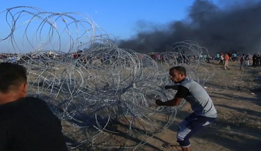 وأشعل الفلسطينيونَ الاطارات المطاطية على طولِ الحدود الشرقية لقطاع ِغزة تزامنا مع اطلاق قواتِ الاحتلال لوابلٍ من قنابلِ الغاز والرصاصِ الحي باتجاه المتظاهرين.