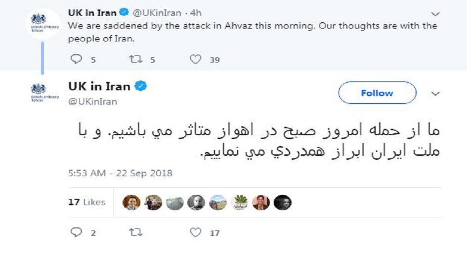 وأعربت سفارة لندن في طهران على حسابها في "تويتر" عن أسفها إزاء الاعتداء الدموي، مؤكدة تعاطف الدبلوماسيين البريطانيين مع الشعب الإيراني.