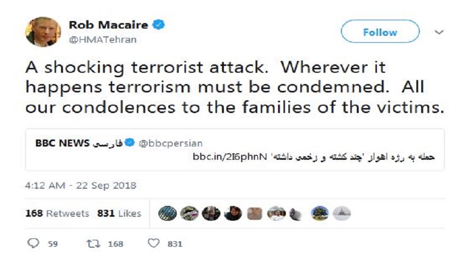 من جانبه، وصف السفير البريطاني لدى إيران، روب ماكير، في "تويتر"، ما حدث بأنه هجوم إرهابي مروع، مشددا على ضرورة إدانة الإرهاب أينما كان.