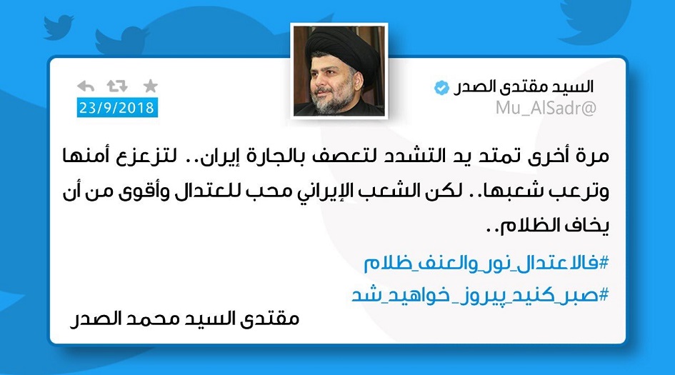 وقال السيد الصدر في تغريدة له على توتير "مرة أخرى تمتد يد التشدد لتعصف بالجارة إيران.. لتزعزع أمنها وترعب شعبها".