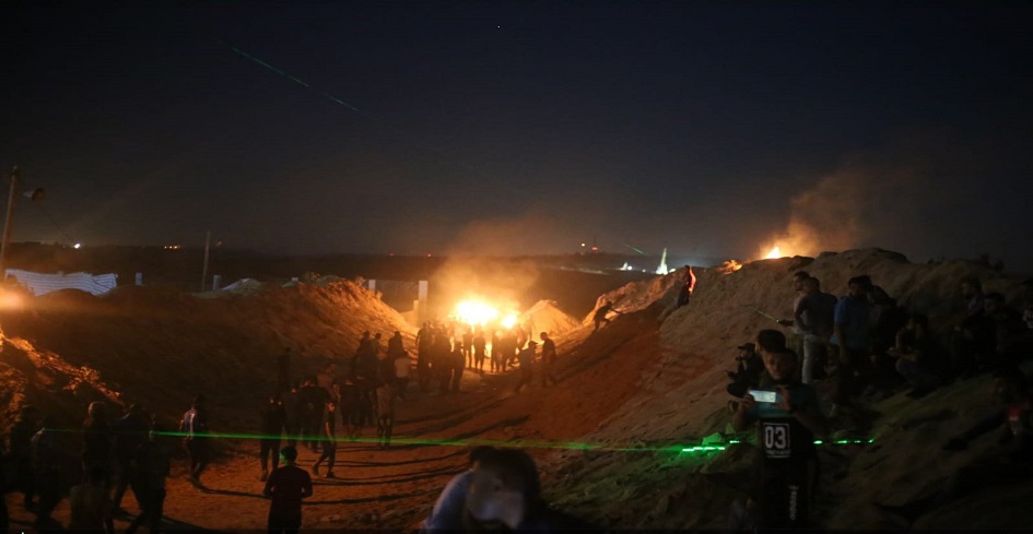 ما أطلقت قوات الاحتلال وابلا من القنابل الصوتية والإنارة قرب مخيمات العودة، لتفريق مئات المتظاهرين المنخرطين في فعاليات الإرباك.