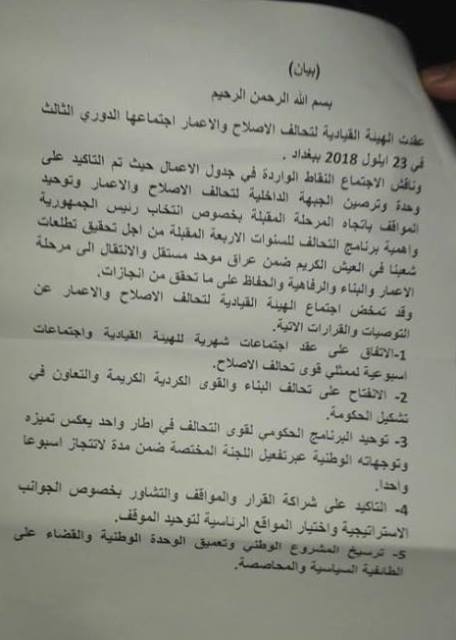 وقال احمد الصدر ممثل زعيم التيار الصدري مقتدى الصدر خلال مؤتمر صحافي عقده امس بعد انتهاء اجتماع تحالف الاصلاح والاعمار في فندق بابل، ان "الاجتماع تمخض عنه عدة توصيات وقرارات منها، التعاون من اجل تشكيل حكومة وطنية وتوحيد البرنامج الحكومي في اطار واحد ينعكس تميزه عبر تفعيل اللجان المختصة في مدة لا تتجاوز اسبوع واحد والتركيز على شراكة القرار والموقف والحوار بشان الجوانب الستراتيجية واختيار المواقع الرئاسية وتوحيد المواقف اضافة الى ترسيخ المشروع الوطني وتوحيد المواقف الوطنية والقضاء على الطائفية السياسية والمحاصصة".
