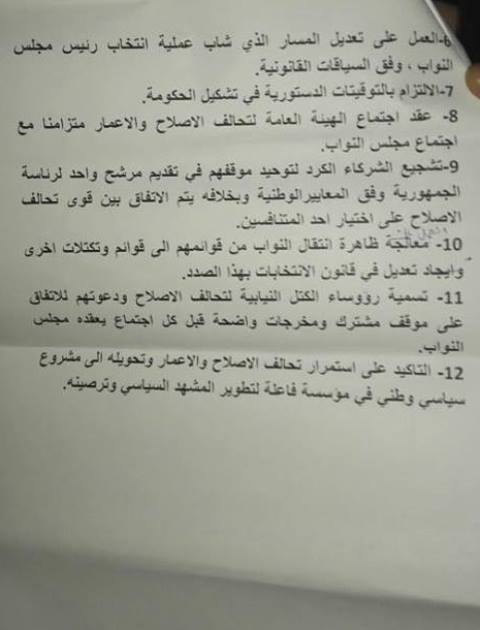 واضاف انه "تم الاتفاق ايضا على العمل لتعديل مسار العملية الانتخابية وماحصل بانتخابات مجلس النواب وفق السياقات القانونية، وترسيخ المشروع الوطني وتعميق الموقف الوطني فضلا عن الالتزام بالتوقيتات الدستورية لتشكيل الحكومة المقبلة"، مشيرا الى "ضرورة "تشجيع الشركاء الكرد لتوحيد موقفهم في تقديم مرشح واحد لرئاسة الجمهورية وفق الاستحقاقات، وبخلافه يتم الاتفاق بين قوى تحالف الاصلاح على اختيار احد المتنافسين".