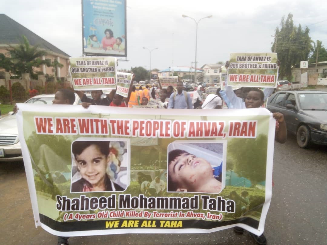 وحمل الأطفال النيجيريون لافتات جابوا فيها الشوارع، وكتب عليها عبارات "كلنا مع أهالي أهواز في إيران" و"كلنا طه" في إشارة إلى الشهيد الطفل محمد طه.