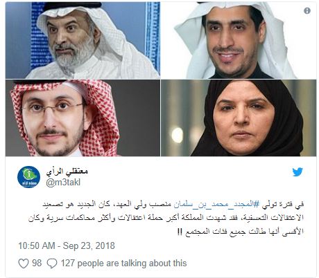 وكان حساب “معتقلي الرأي”، قد كشف بشكل تفصيلي، هويات من اعتقلتهم السلطات السعودية، في عهد ولي العهد محمد بن سلمان، الذي عين بهذا المنصب منتصف العام الماضي.