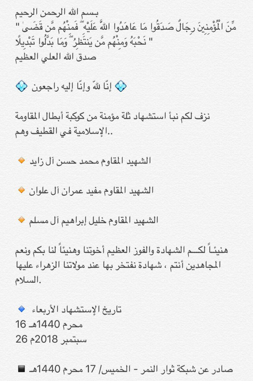 وحسبما افادت شبكة ثوار النمر في القطيف ان الشهداء هم محمد حسن آل زايد، ومفيد حمزة العلوان، وخليل إبراهيم آل مسلم، وجميعهم سعوديون.