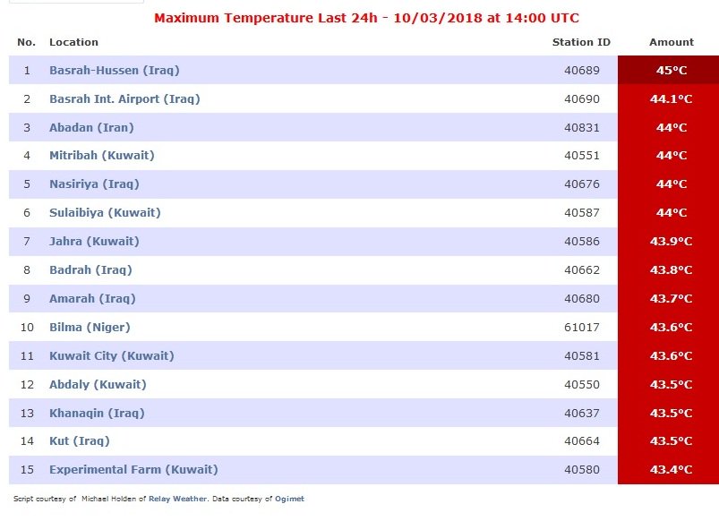 وبحسب محطة "بلاسيرفيلي" العالمية المعنية بالأنواء الجوية، فإن سبع مدن عراقية من أصل 15 مدينة مدرجة بجدول المدن الأعلى حرارة في العالم. وأدناه جدول المدن الأعلى حرارة: