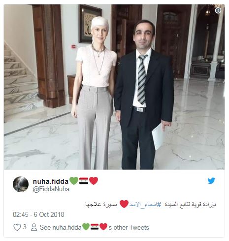 وبعد ذلك، نشرت حسابات سورية صورة تظهر الأسد وزوجته خلال تلقيها العلاج في مشفى عسكري بالعاصمة دمشق.