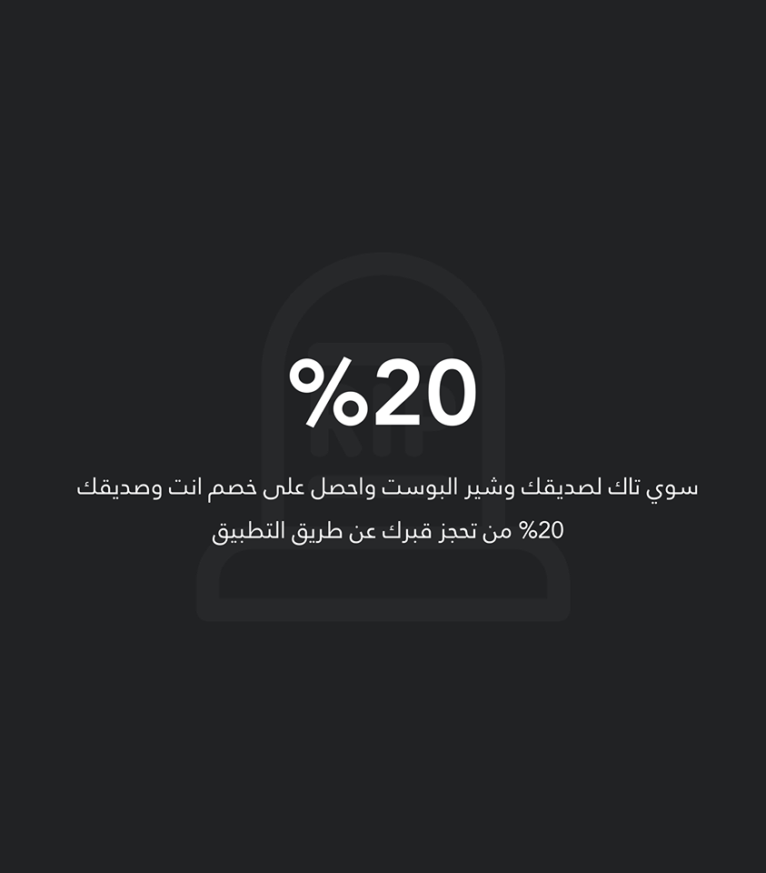 وأضاف: "سوّي {اعمل} تاغ {إشارة} لصديقك لهذا البوست واحصل على خصم 20% لك ولصديقك عندما تحجز قبرا عن طريق التطبيق".