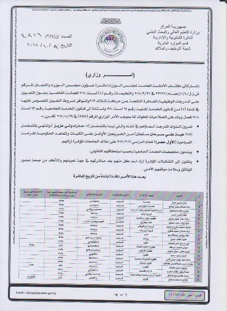 العراق - الكوثر: وثائق تتضمن الامر الصادر من وزارة التعليم بشأن تعيين الأوائل على الكليات والمعاهد للعام الدراسي 2016 -2017.