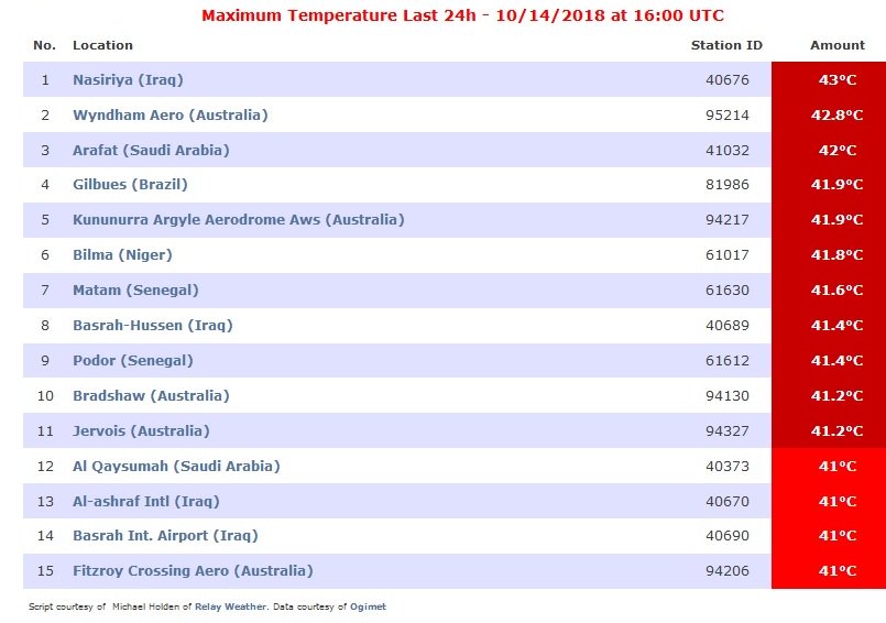 ونشرت محطة "بلاسيرفيلي" في كاليفورنيا الأمريكية، جدولاً بأعلى درجات الحرارة في العالم، والتي بينت أن مدينة الناصريية جاءت بالمرتبة الاولى ومن ثم مدينة ويندهام الاسترالية ثانياً ومنطقة عرفات السعودية ثالثاً، من أصل 15 مدينة مدرجة بالجدول احتلت مراكز الأعلى بدرجات الحرارة.
