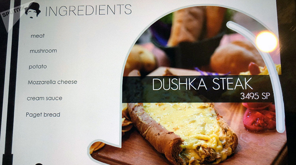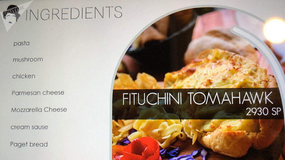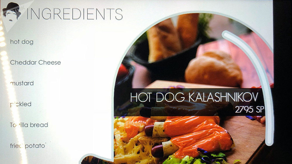 وتتضمن قائمة الطعام في المطعم مأكولات ذو مسميات حربية: سباغيتي "إس-300"، هوت دوغ "كلاشنيكوف" وطبق الفيتوتشيني "توماهوك" نسبة للصاروخ الذي استخدمته الولايات المتحدة في غارة جوية في أبريل/ نيسان الماضي، بالإضافة إلى شريحة اللحم "دوشكا".