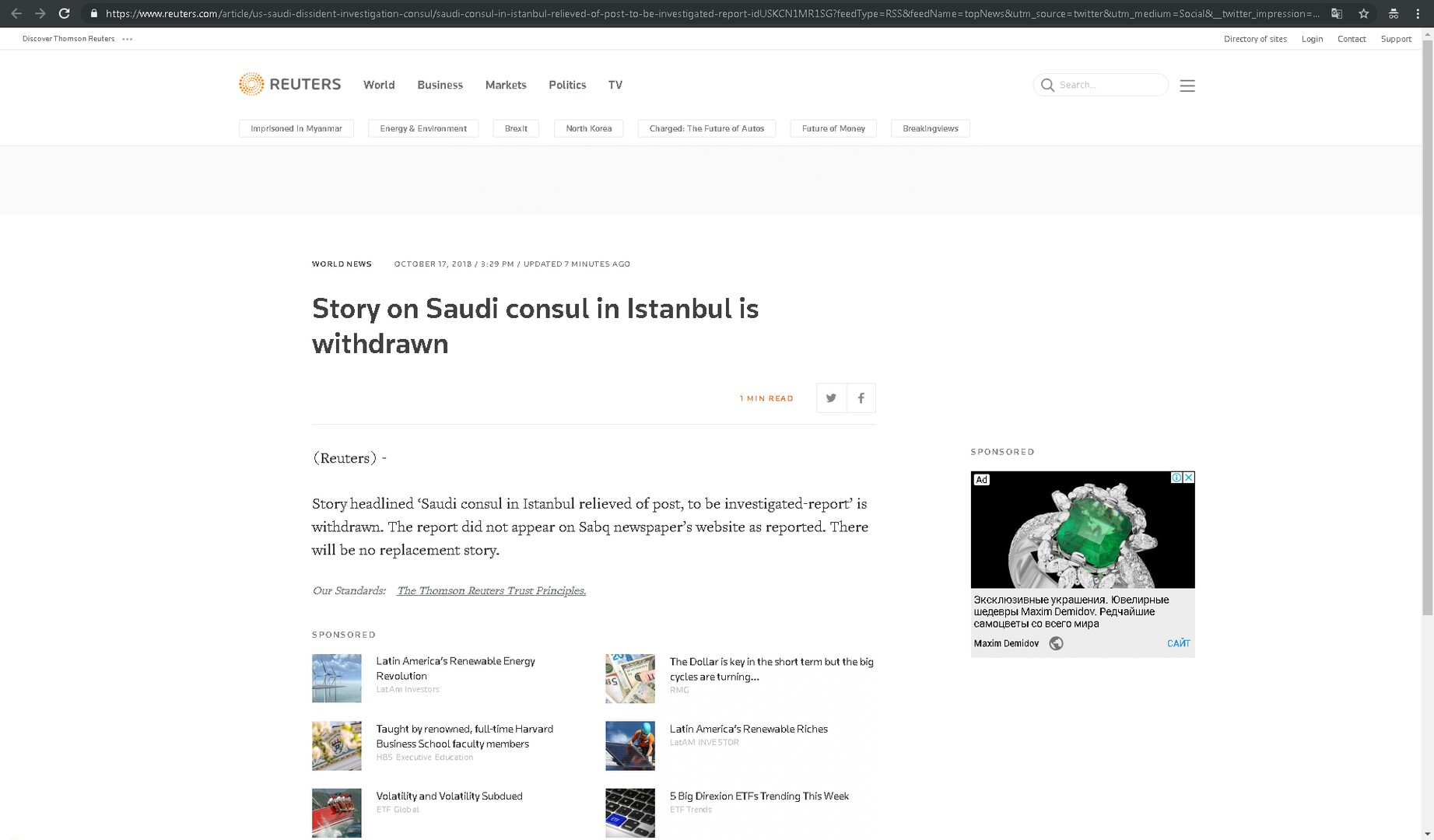 كما لم يتسن لنا العثور على المقال المنشور على موقع صحيفة "سبق" والذي نقلت منه وكالة رويترز تفاصيل الخبر.