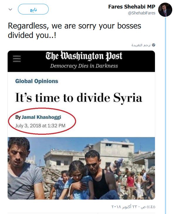 وضجت وسائل التواصل الاجتماعي بهذا السيناريو المرعب، ومن منا ينسى مقالة خاشقجي في "واشنطن بوست" عندما قال "حان الوقت لتقسيم سوريا"، وفي التويتر رصدنا لكم تعليقا قد يكون الاقسى في تاريخ الصحافة والاكثر تعبيرا على حد سواء حول سيناريو تقطيع خاشقجي عندما اعاد عضو مجلس الشعب السوري "فراس شهابي" تغريد مقالة خاشقجي عن تقطيع اوصال سوريا كما رغب بها النظام السعودي، وعلق قائلا: " حان الوقت لتقسيم سوريا؟، بغض النظر .. معذرة أسيادك قسَّموك !".