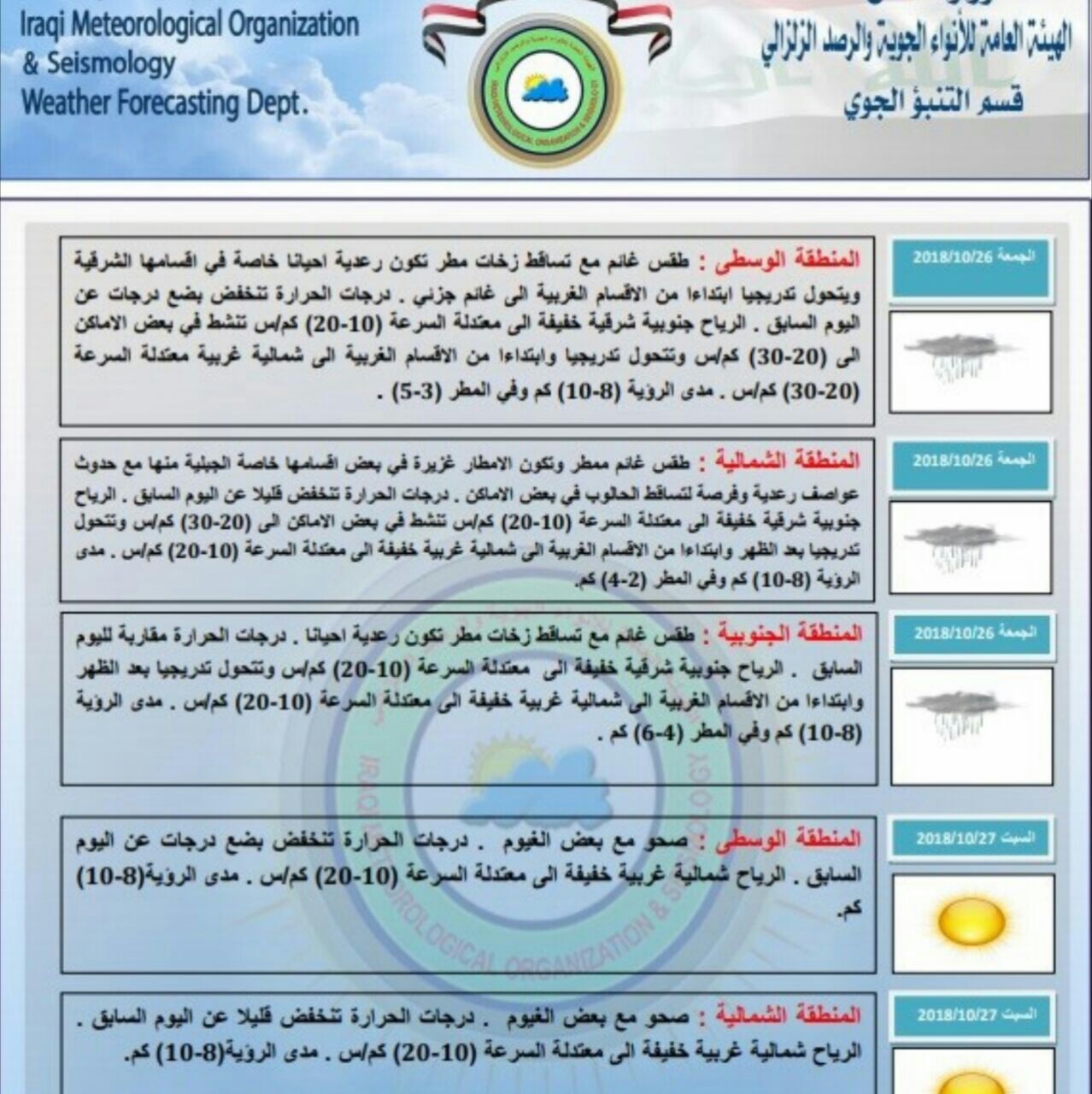 وقالت الهيئة في بيان لها، امس، 25 تشرين الول 2018، إن "المناطق الوسطى والجنوبية ستشهد اليوم، طقسا غائما مع تساقط زخات مطر تكون رعدية احيانا ودرجات حرارة تبلغ الـ30، فيما ستشهد المناطق الشمالية طقسا غائما ممطرا وتكون الامطار فيه غزيرة.