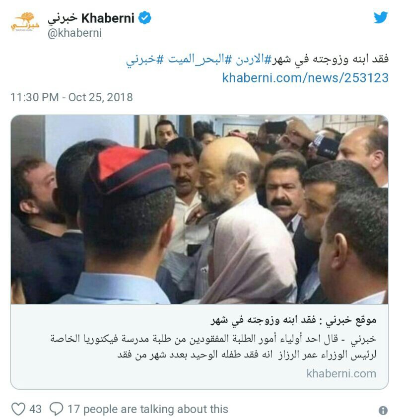 وكانت مصادر طبية أردنية أعلنت أمس أن السيول تسببت بمقتل 18 شخصا وإصابة العشرات أغلبهم أطفال في مأساة البحر الميت، إضافة إلى عشرات المفقودين، فيما تستمر الأجهزة المعنية بعمليات البحث والإنقاذ.