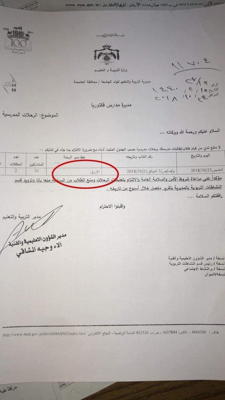 وأوضحت الوثيقة أن المخالفات تضمنت تغيير مسار الرحلة المصرح بها من وزارة التربية والتعليم من منطقة الأزرق إلى البحر الميت، وإشراك طلبة من صفوف الرابع والسادس، في حين أن موافقة وزارة التربية والتعليم كانت محصورة بطلبة صفوف السابع والثامن والتاسع.