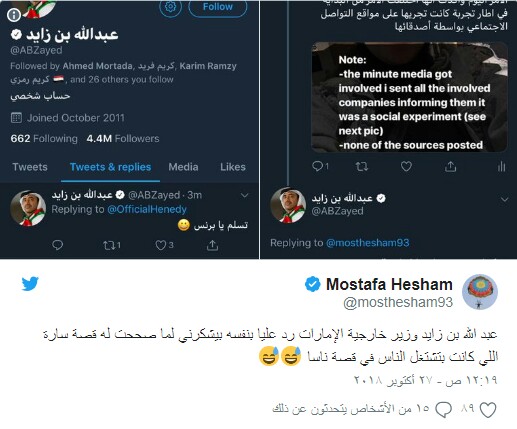 وكان من بين المنخدعين بمزحة الفتاة المصرية، وزير الخارجية والتعاون الدولي الإماراتي، عبد الله بن زايد، والذي أوضح له أن القصة غير حقيقية، وأكدت أنها اختلقت الأمر في إطار تجربة كانت تجريها على مواقع التواصل الاجتماعي بواسطة أصدقائها.