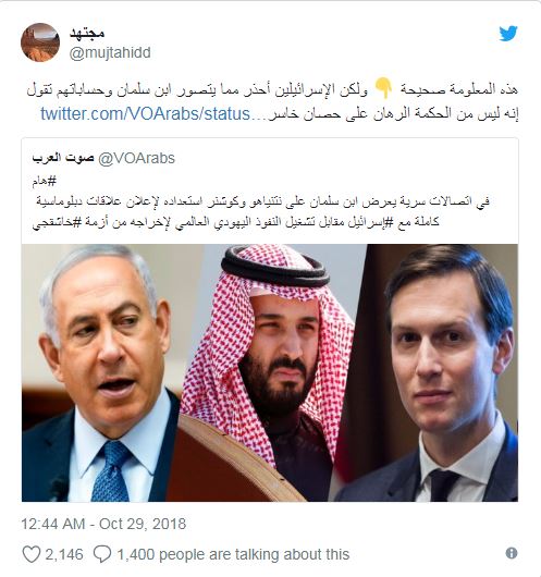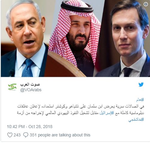 وكان حساب “صوت العرب” على موقع التدوين المصغر “تويتر” قد ذكر هذه المعلومة قائلا:” #هام في اتصالات سرية يعرض ابن سلمان على نتنياهو وكوشنر استعداده لإعلان علاقات دبلوماسية كاملة مع #إسرائيل مقابل تشغيل النفوذ اليهودي العالمي لإخراجه من أزمة #خاشقجي”.