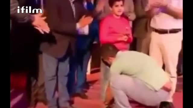 ويظهر النجم مصطفى زماني في الفيديو ينحني ليربط حذاء طفل على منصة مهرجان بابل للثقافة والفنون بنسخته السابعة في المدينة الأثرية.