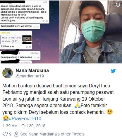 وقال موقع News.com.au، إن الراكب ديريل فيدا فيبريانتو (22 عاما)، قام قبيل إقلاع الطائرة بدقائق، بإرسال صورة سيلفي لزوجته التي عقد قرانه عليها قبل شهرين فقط. وظهر الشاب جالسا في مقعده بالطائرة مرتديا قناعا طبيا أخضر اللون.